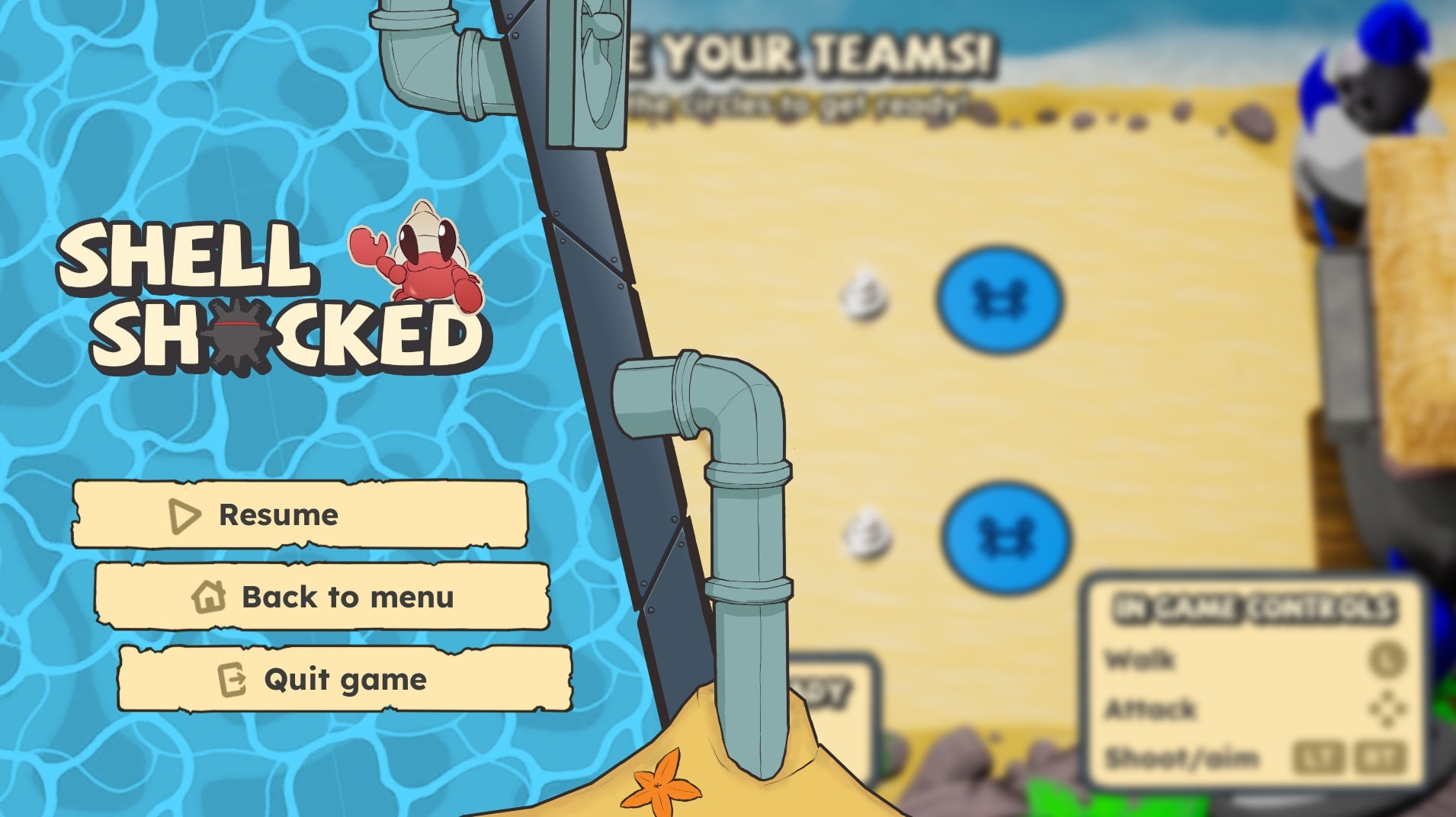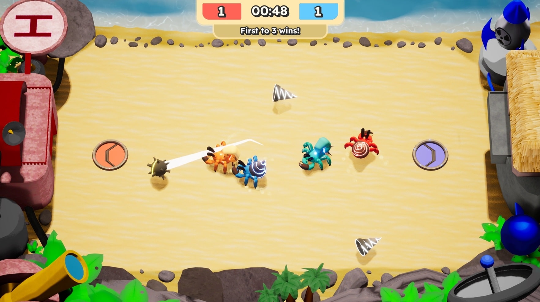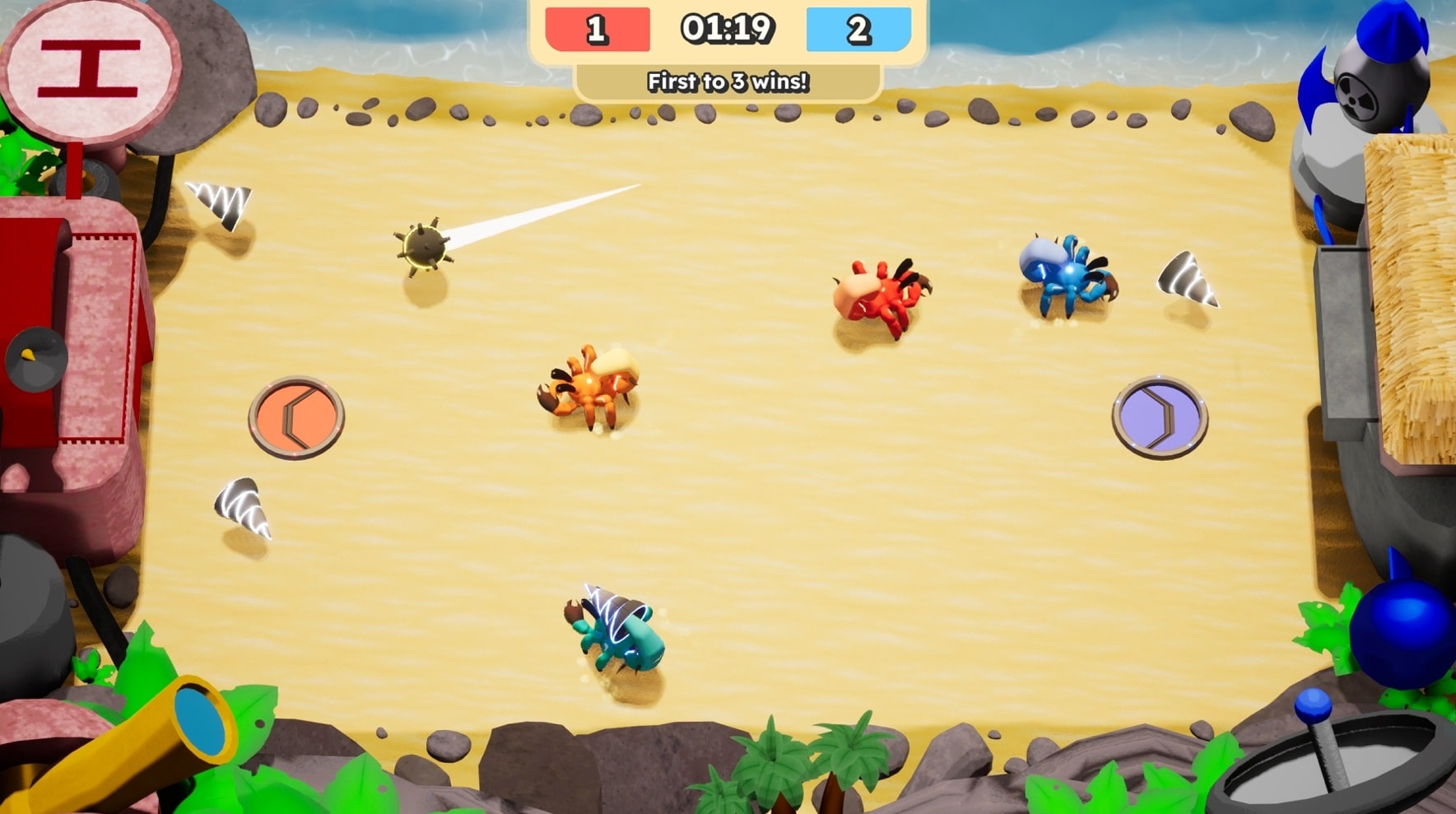 Shell Shocked is a 2v2 couch coop game where you play as a mechanized hermit crab trying to get a mine into the opposing team's goal. Stun crabs, shoot shells, and hit the ball to try and get the highest score for your team and win in the chaos! Get ready to be Shell Shocked!